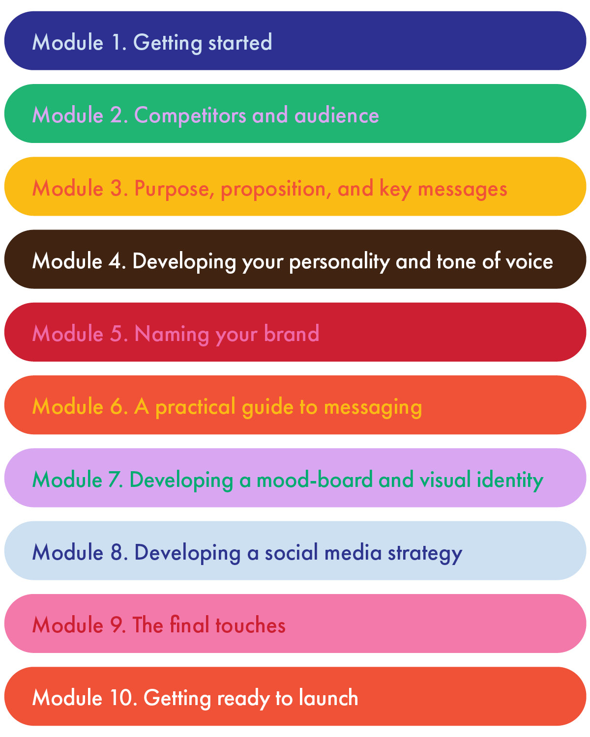 By the end of the 10 modules that take you through our custom brand building process you will have: